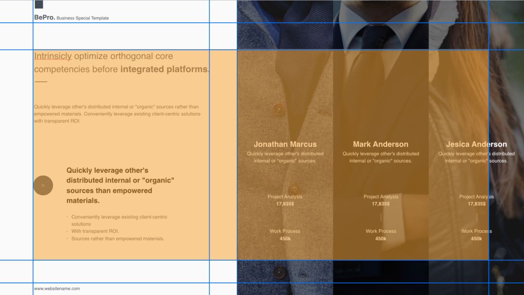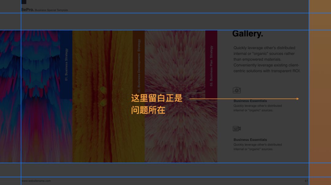 问题就显而易见的多了,接下来我们补全这部分排版缺陷,有很多方法,比如添加装饰线,添加色块,或者改变左侧图片的版心占据位置,如图: