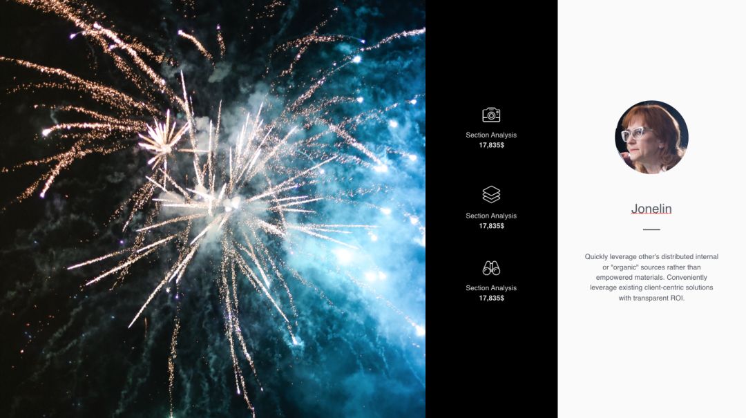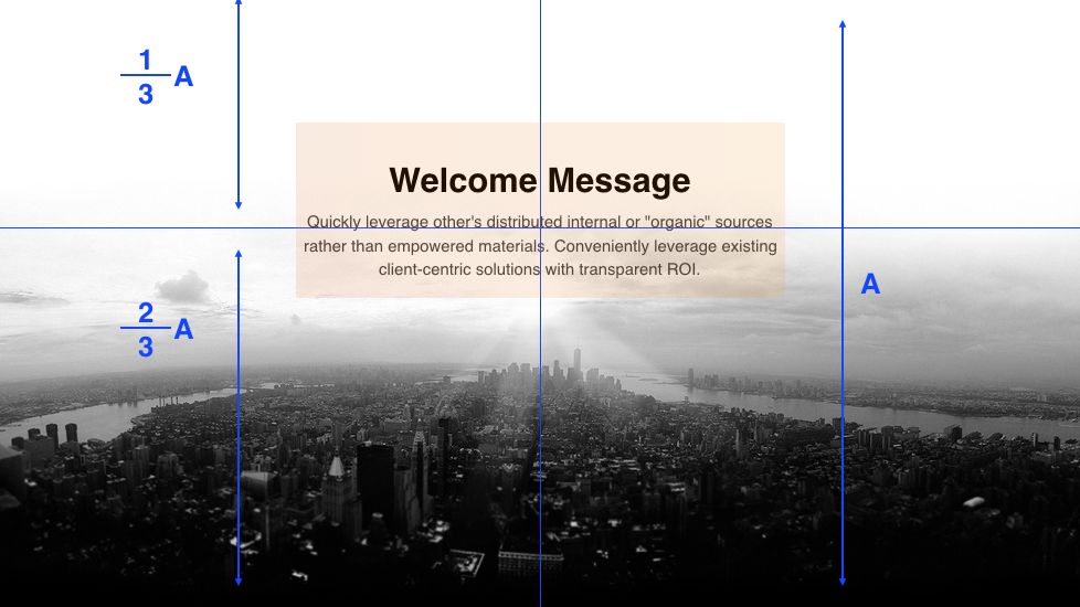 我们会看到很多全图型的PPT封皮都会将标题文字放置在趋近黄金分割的位置上。如图所示,你其实不用太执着具体是不是0.618,因为幻灯片本身16:9的画幅面积就并非按照黄金分割长度和宽度,你大概取画面的1/3位置即可。