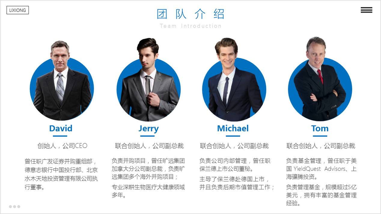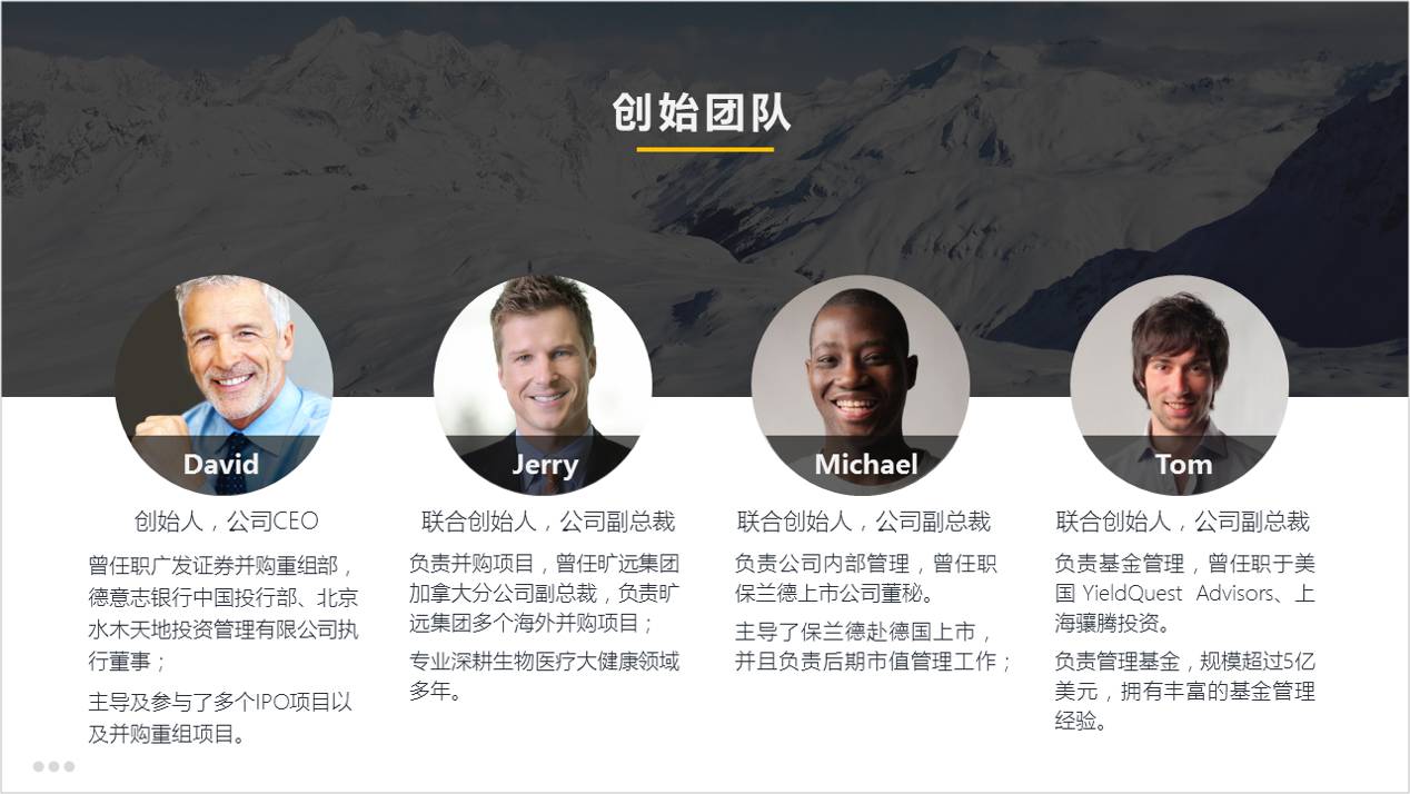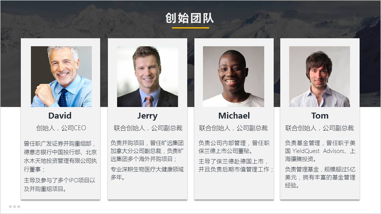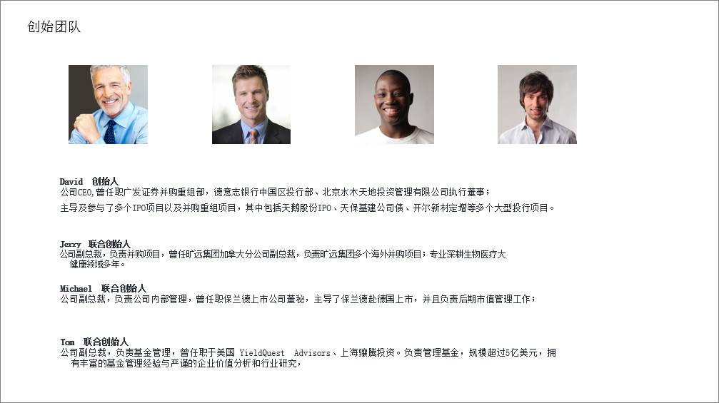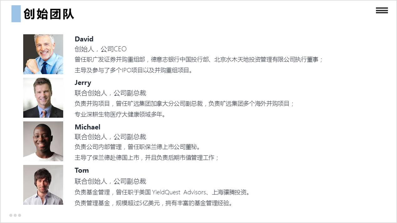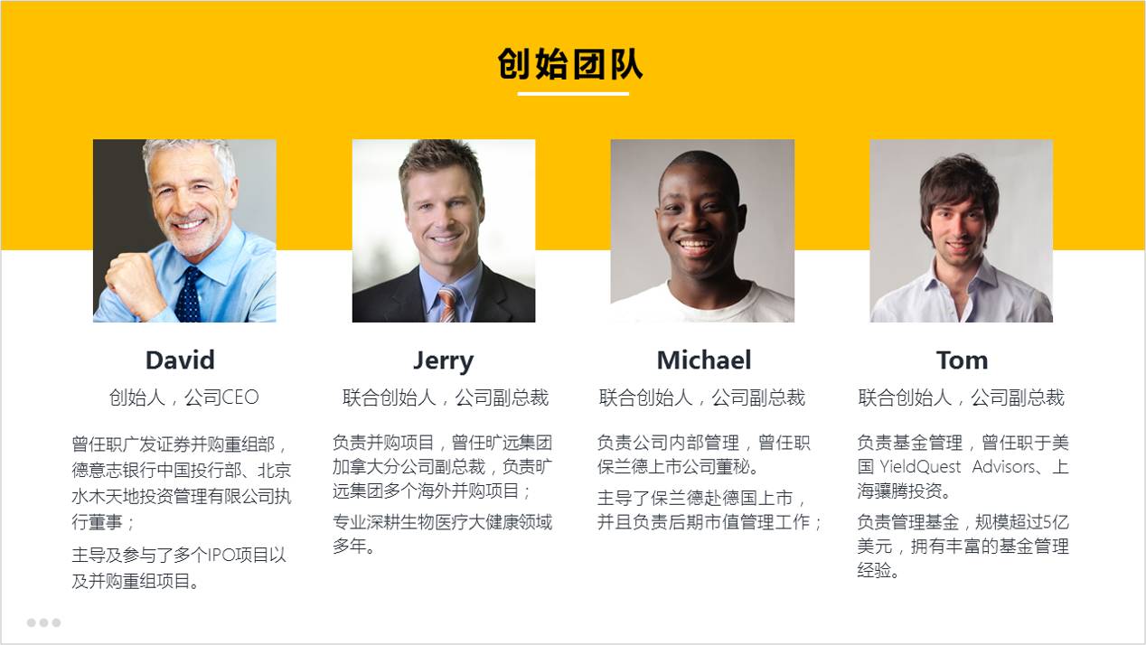 团队介绍,是PPT中最常见内容,无论是公司简介、项目介绍还是融资方案,都有这么一页,它是用来介绍公司的核心团队的。