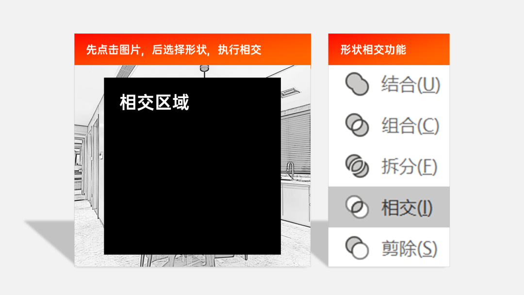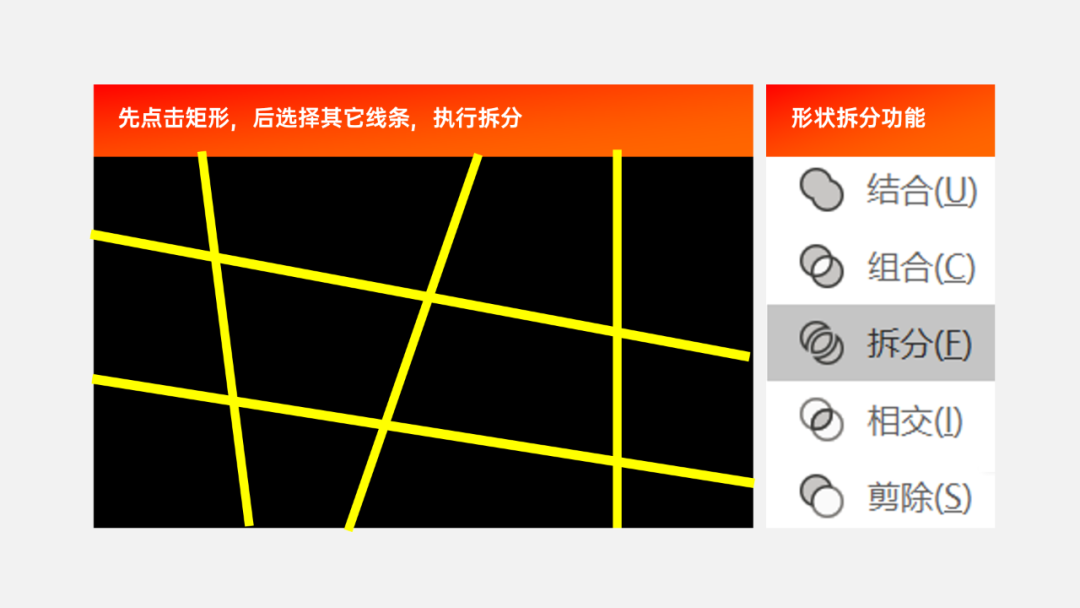 其实这个更简单,主要会用到 PPT 布尔运算中的拆分功能。啥意思呢?做个简单的演示。