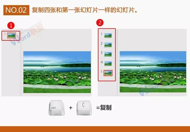 2、复制四张和第一张幻灯片一样的幻灯片。