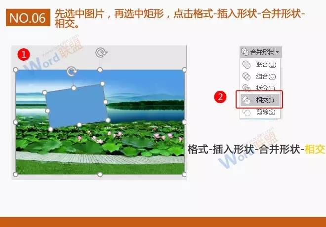 6、先选中图片,再选中矩形,点击格式-插入形状-合并形状-相交。