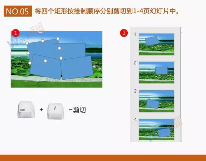 5、将四个矩形按绘制顺序分别剪切到1-4页幻灯片中。