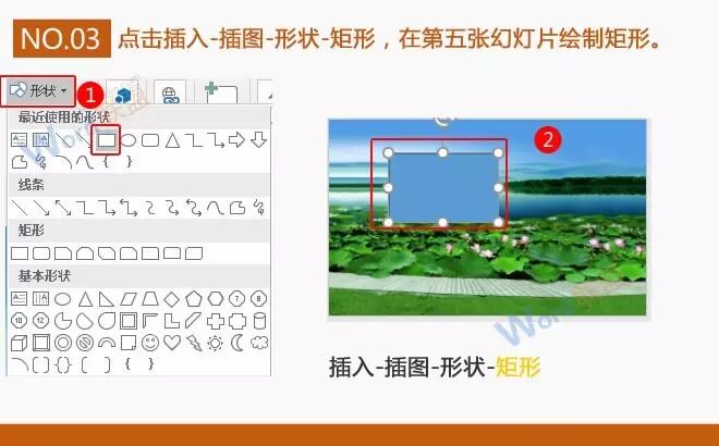 3、点击插入-插图-形状-矩形,在第五张幻灯片绘制矩形。