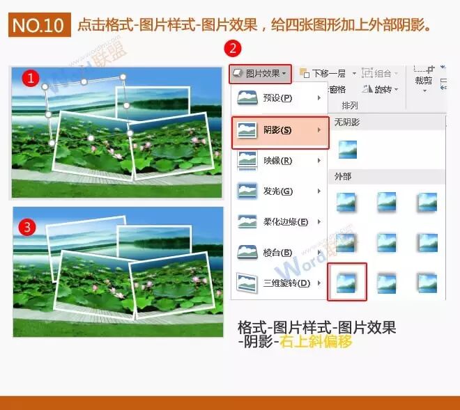 10、点击格式-图片样式-图片效果,给四张图形加上外部阴影。