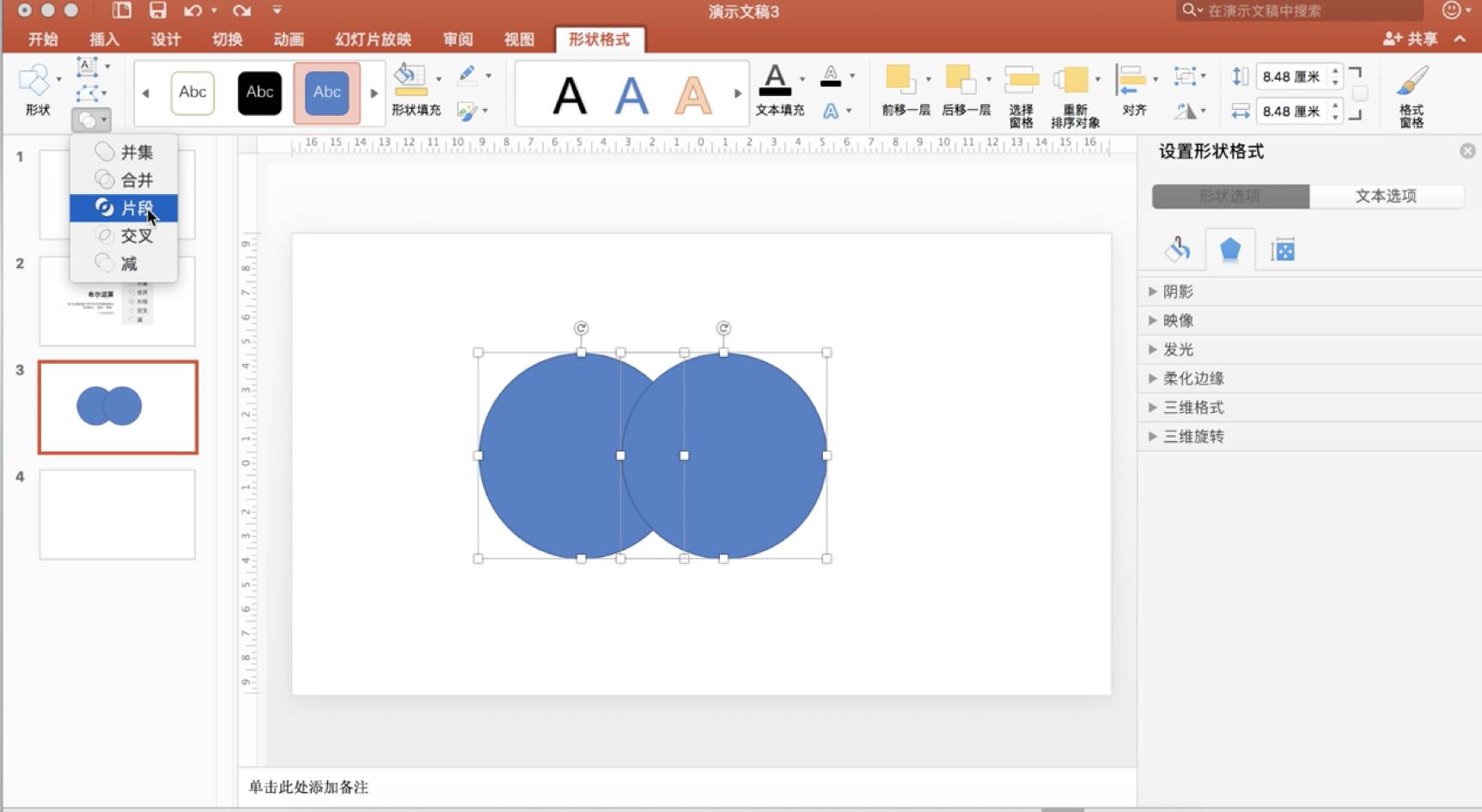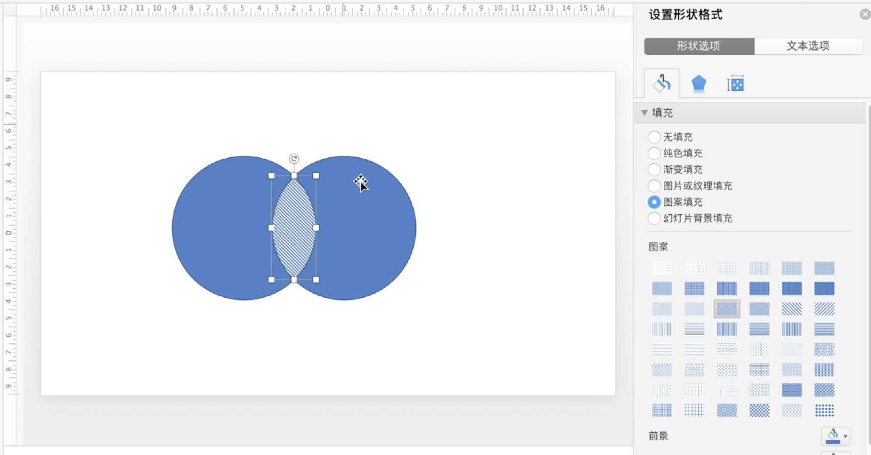 然后选中两个图形,点击“片段”就可以得到三个分离的图形,再选择中间交叉的图形填充图案即可。