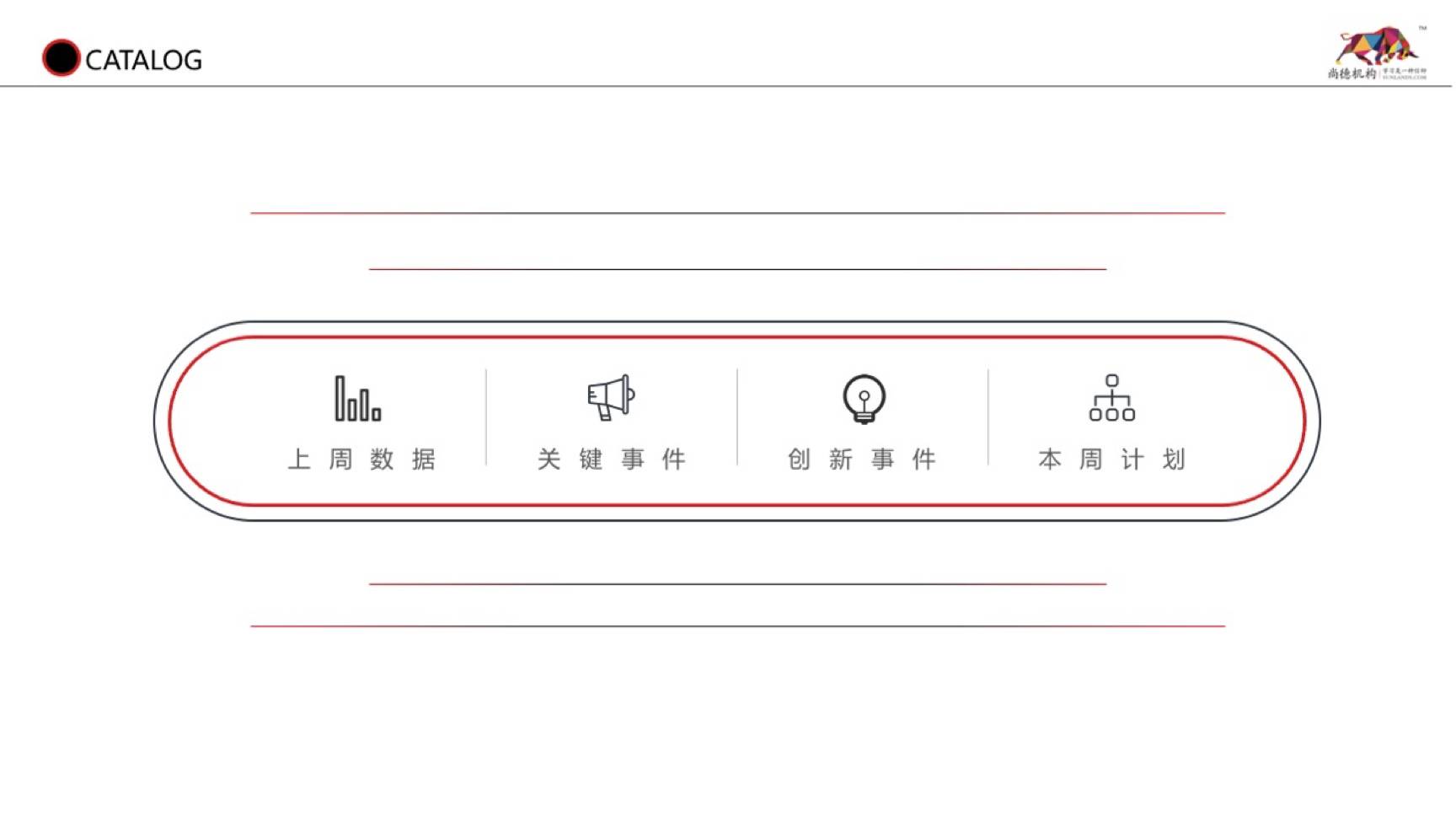 这是一份汇报的PPT模板,这种汇报大多时候不需要汇报人讲解,所以我在开头加入了目录页,并分别在数据、关键事件、创新事件和本周计划上面加入了图标元素。