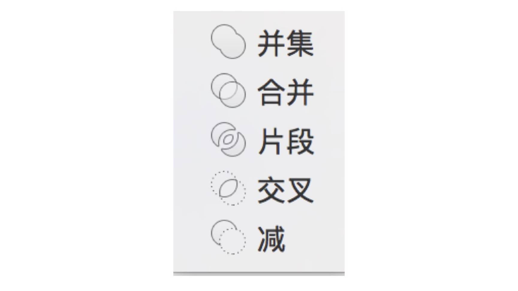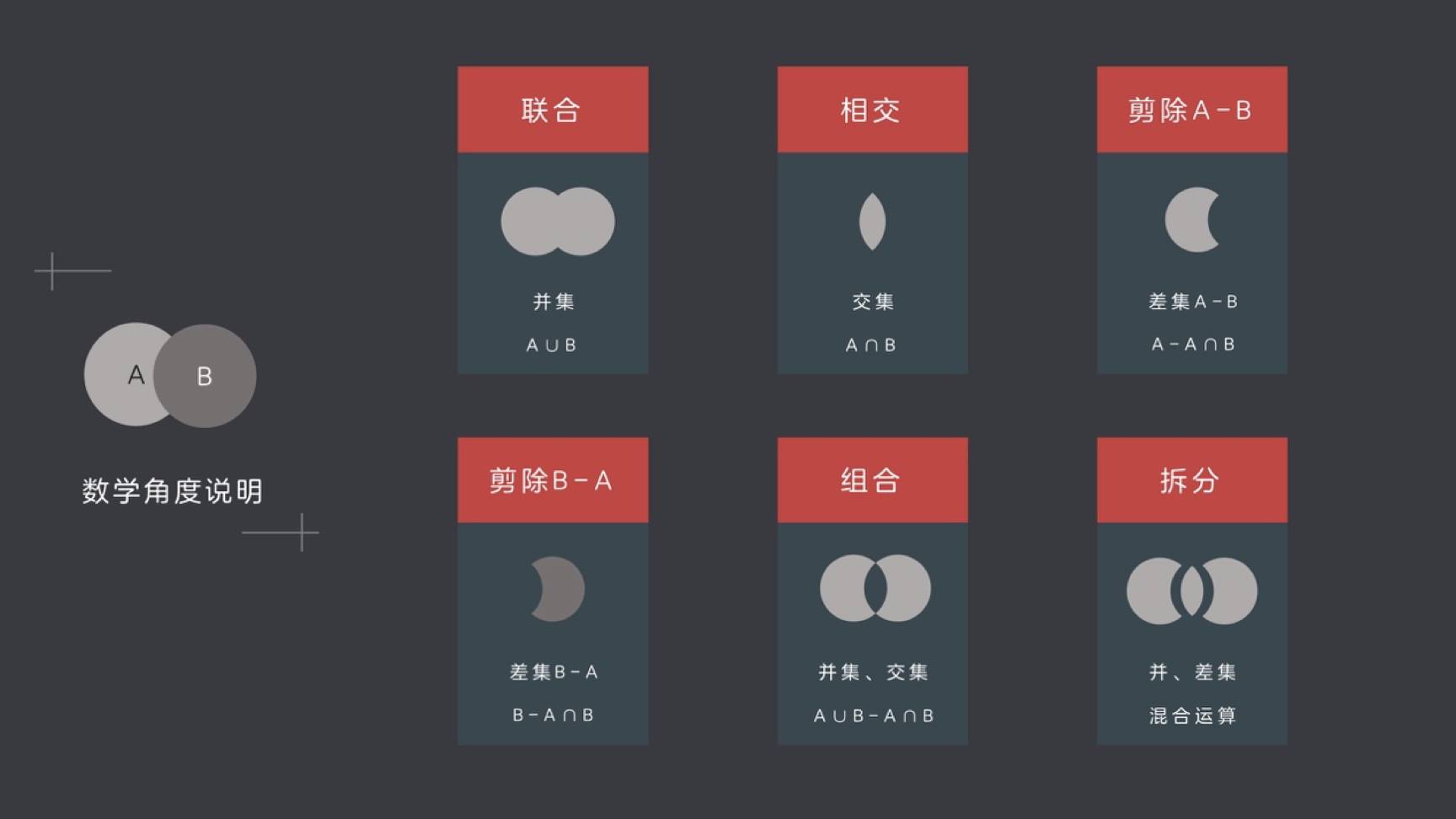 这是PPT中布尔运算给我们的呈现的功能,有并集,合并,片段,交叉和减。为了让大家更加直观的理解这几个功能,可以参考下面这张图片。