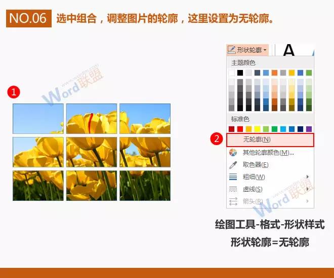 6、修改图片的轮廓。选中组合,在“绘图工具-格式”组中将形状轮廓设置为“无轮廓”。大家也可以根据自己的需要将轮廓设置为合适的颜色和粗细。