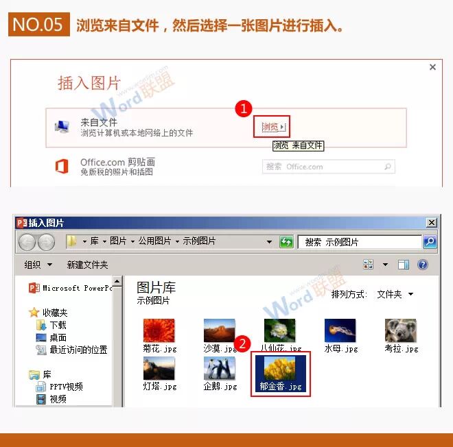5、此时会弹出“插入图片”窗口,我们单击“来自文件”中的“浏览”按钮,跳转到“插入图片”对话框,找到合适的图片插入。