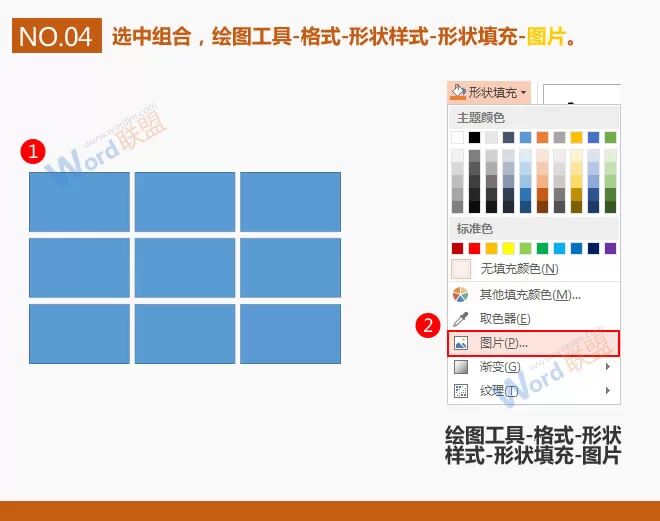 4、选中组合,在“绘图工具-格式”选项卡的“形状样式”组中选择“形状填充”,然后在下拉菜单中选择“图片”。
