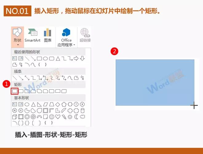 1、切换到“插入”选项卡,在“插图”组中的“形状”中选择“矩形”,然后在PPT中绘制一个矩形。