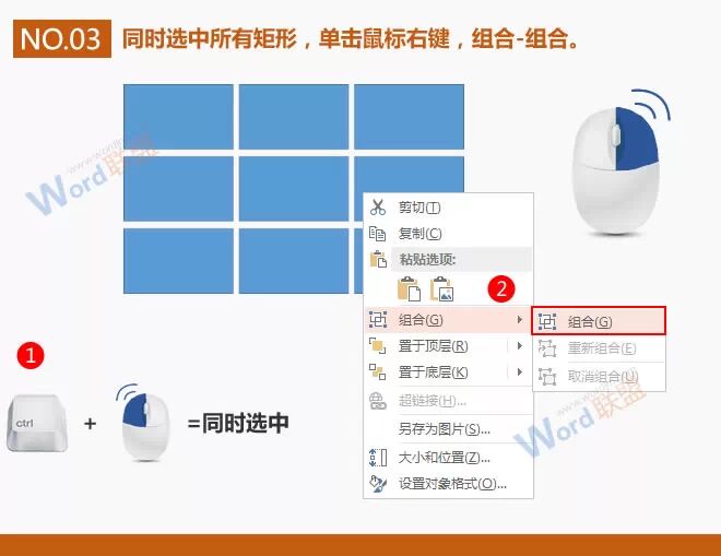 3、按住Ctrl键同时选中这九个矩形,然后单击鼠标右键,选择组合-组合。