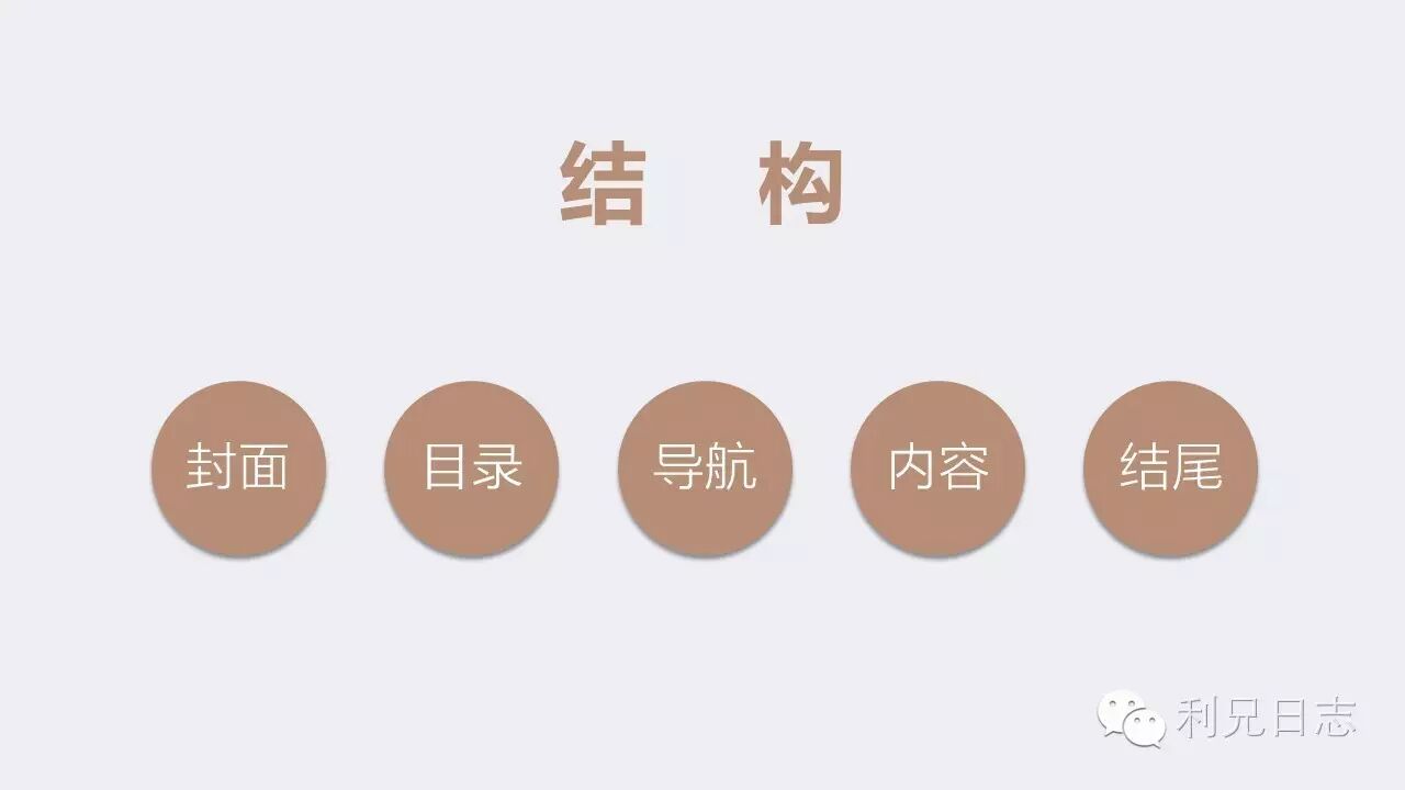 从整体结构上来说,PPT包含五个方面,封面,目录,导航,内容以及结尾。其中,封面是PPT的脸,是PPT的第一眼,所以很关键;目录,能够让读者清晰的知道整个PPT的结构内容,所以也是不可或缺的;导航,作为章节和章节的分割,有一定的用处,但是可有可无;内容是作为PPT的核心部分,是我们着重要进行排版和设计的;结尾,作为一个PPT的最后一页,要起到收尾的作用。
