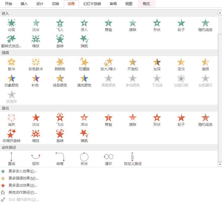 首先动画的种类繁多,除了页面之间的切换动画之外,针对页面内各对象,还有四大类动画,分别是进入动画、强调动画、退出动画以及路径动画。