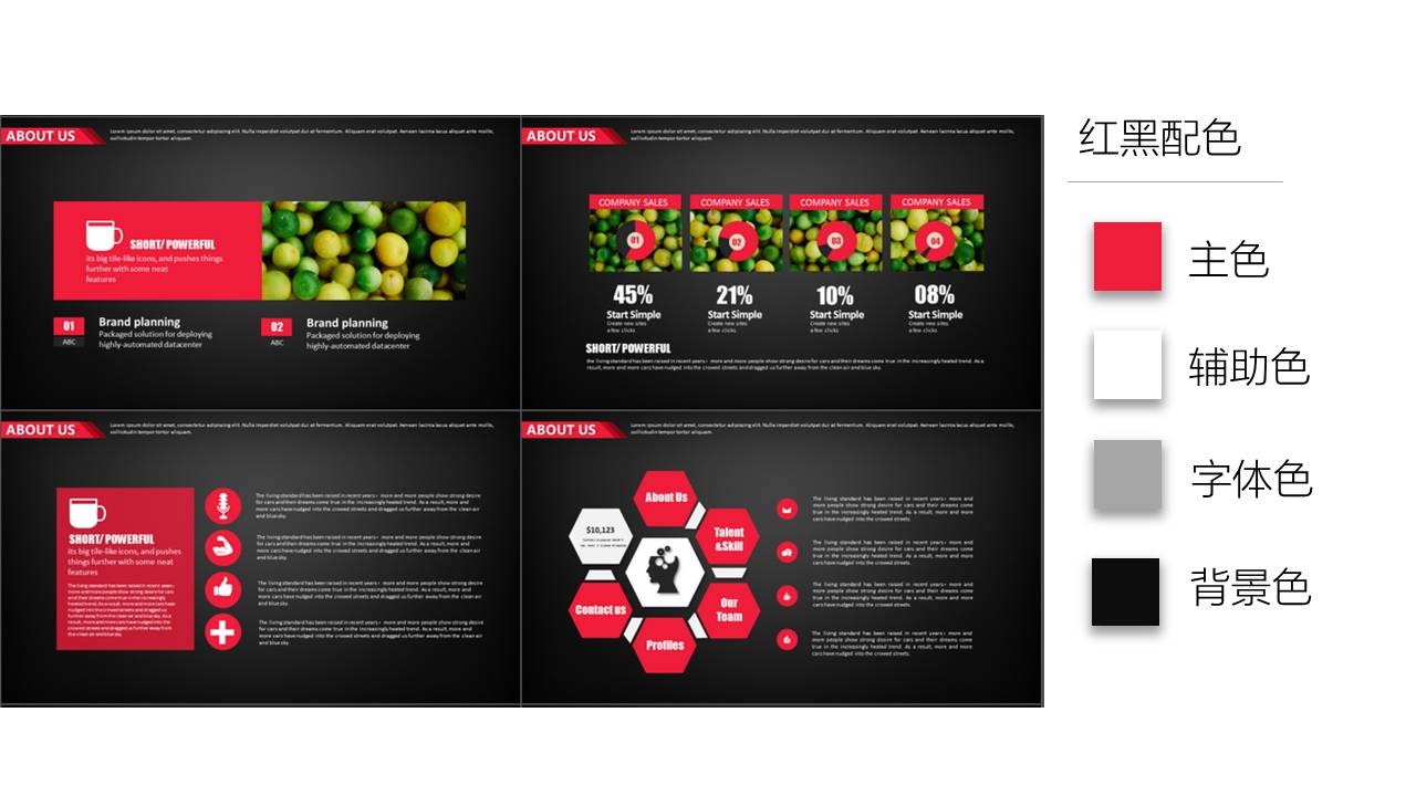 公司的简介PPT或者提案经常会使用到,这时候选用跳色时要考虑到公司的形象识别系统(CIS),经常会在logo上提取颜色,充当跳色。