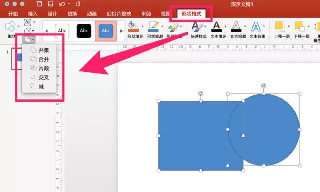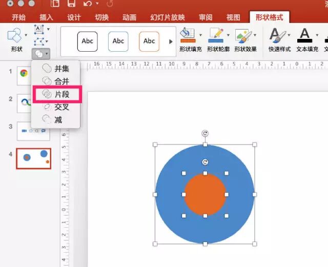 2、将两个圆形重叠放置,圆形重合,然后用合并图形的“片段”。