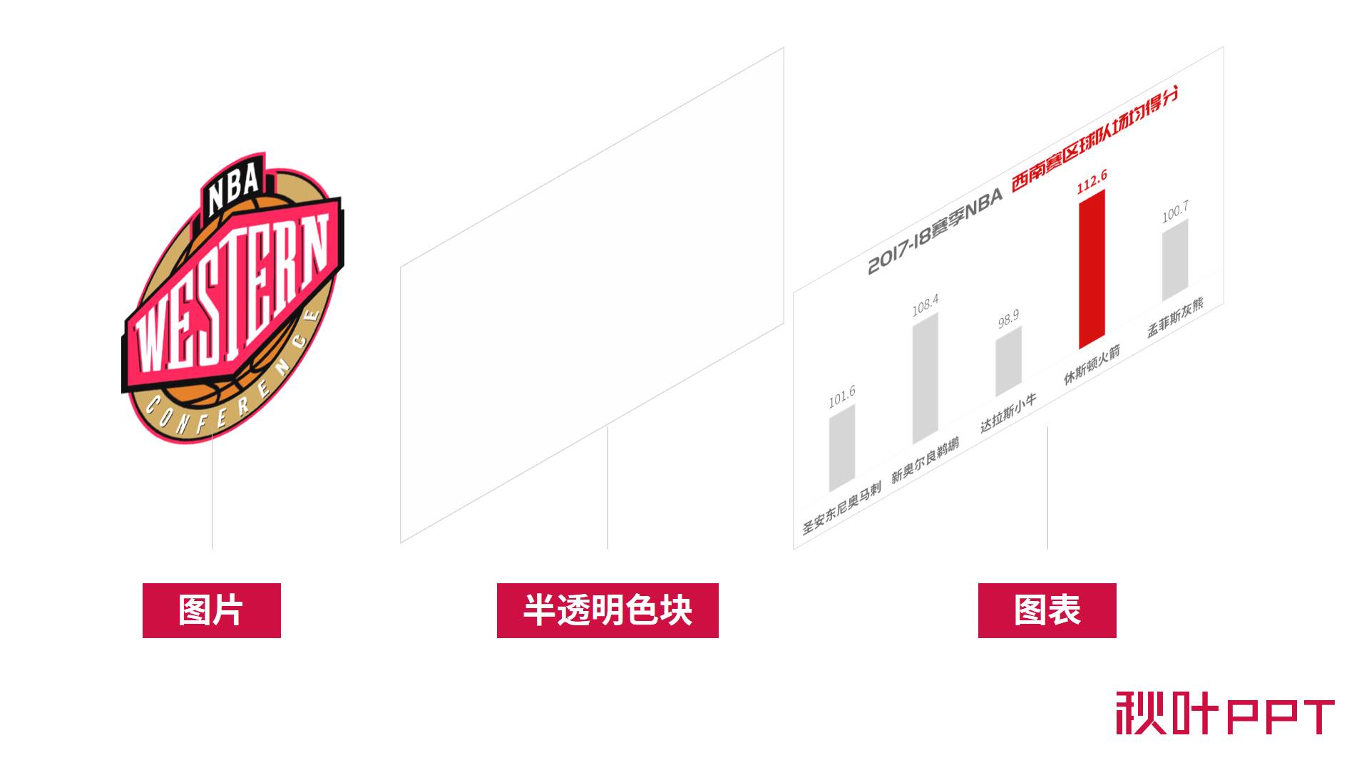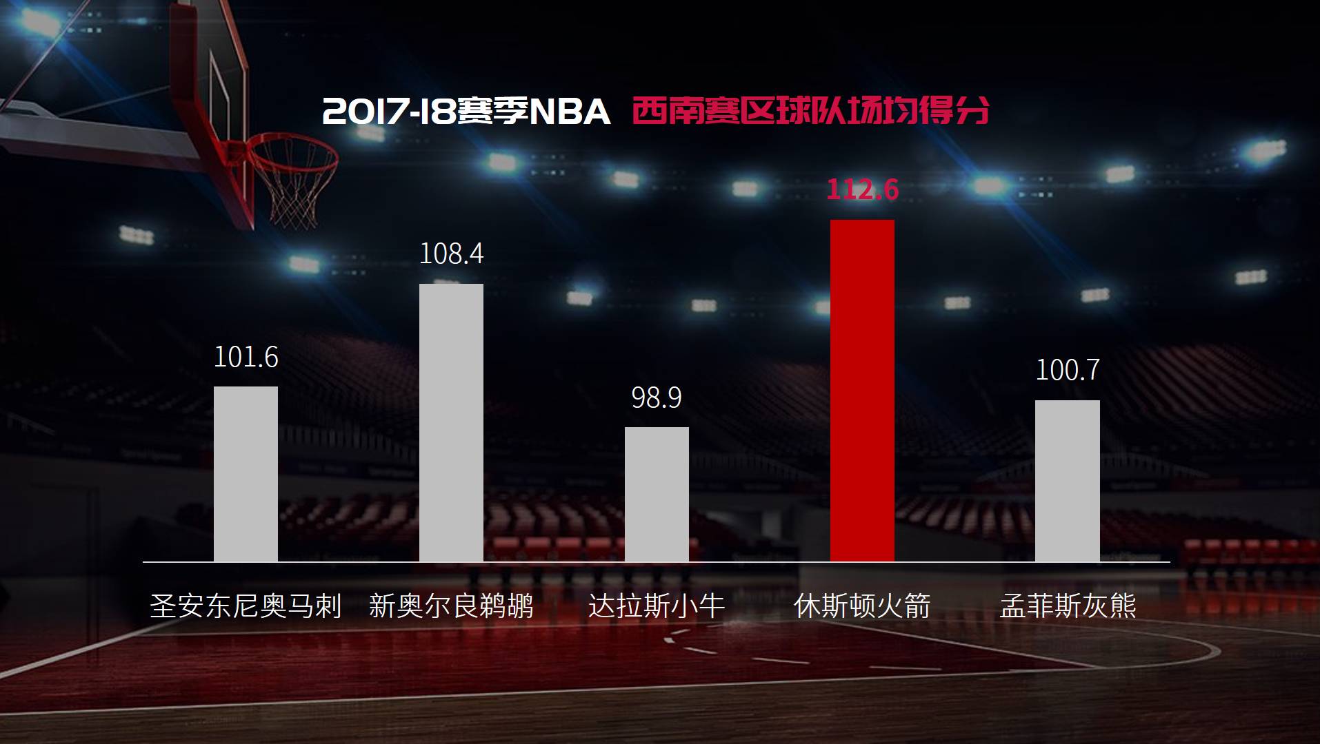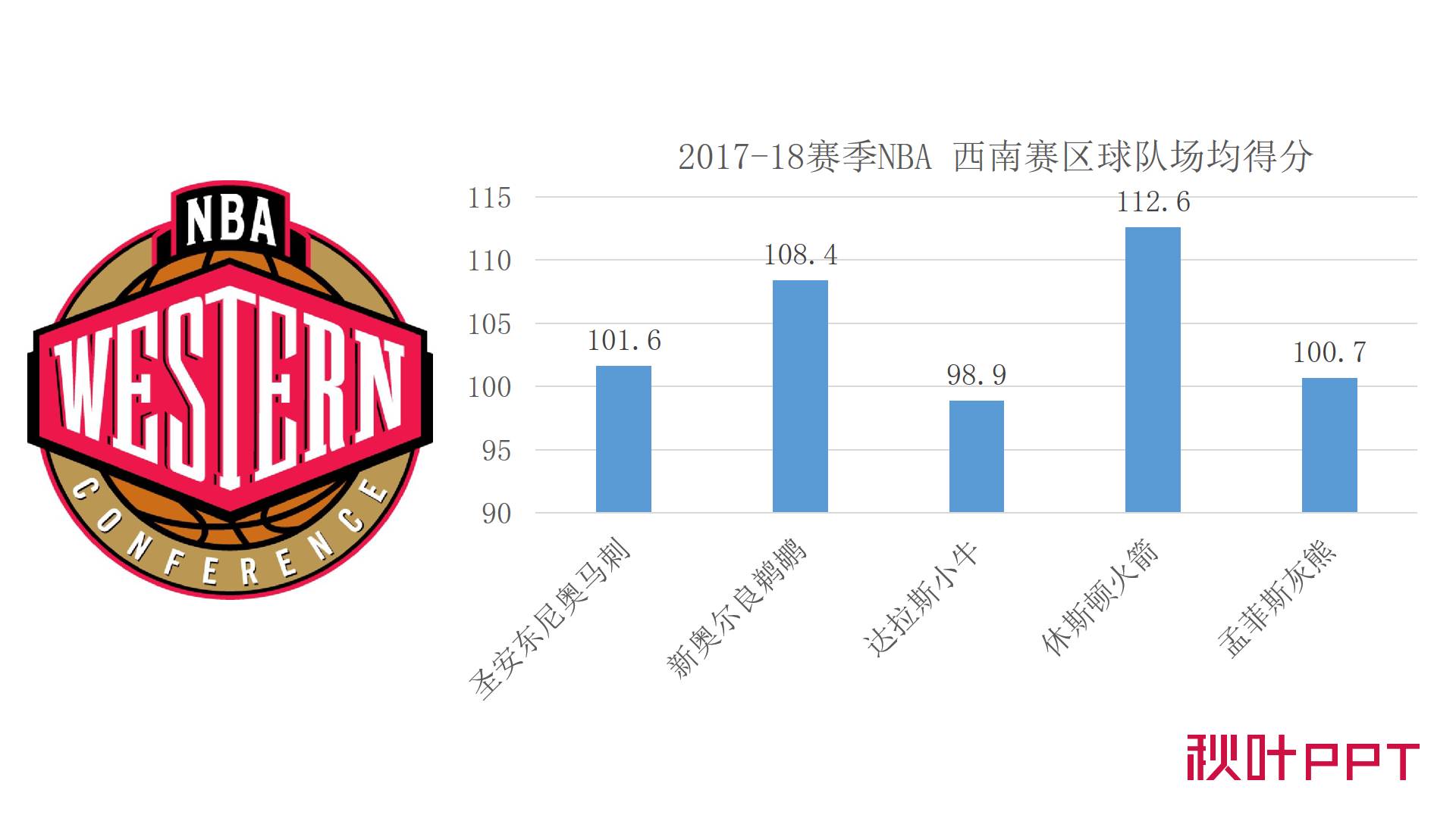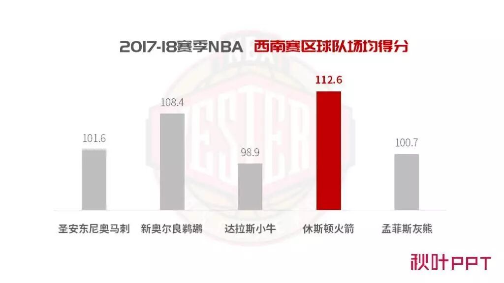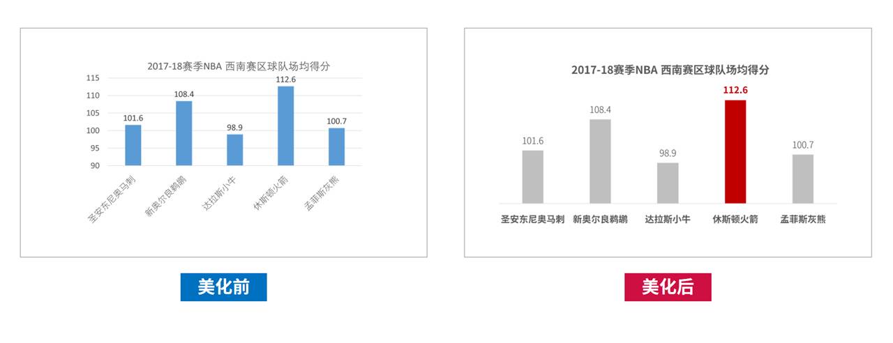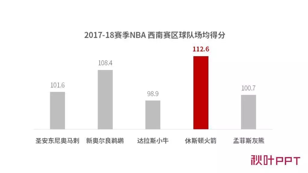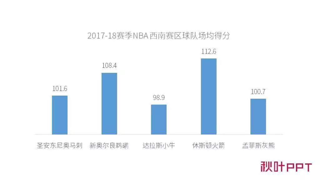 如图,我们所要表达的是「西南地区球队场均得分」的情况,反映的是各个球队之间的数据对比,所以我们应该选择的是柱状图或者条形图。