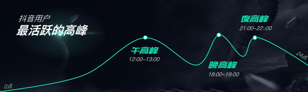2、我们根据抖音用户活跃时间,我们绘制了一条零点到二十四点的时间曲线,上面有三个高峰。