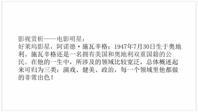 这是一页纯文字型的PPT,文字的内容主要是介绍电影明星,阿诺德·施瓦辛格。