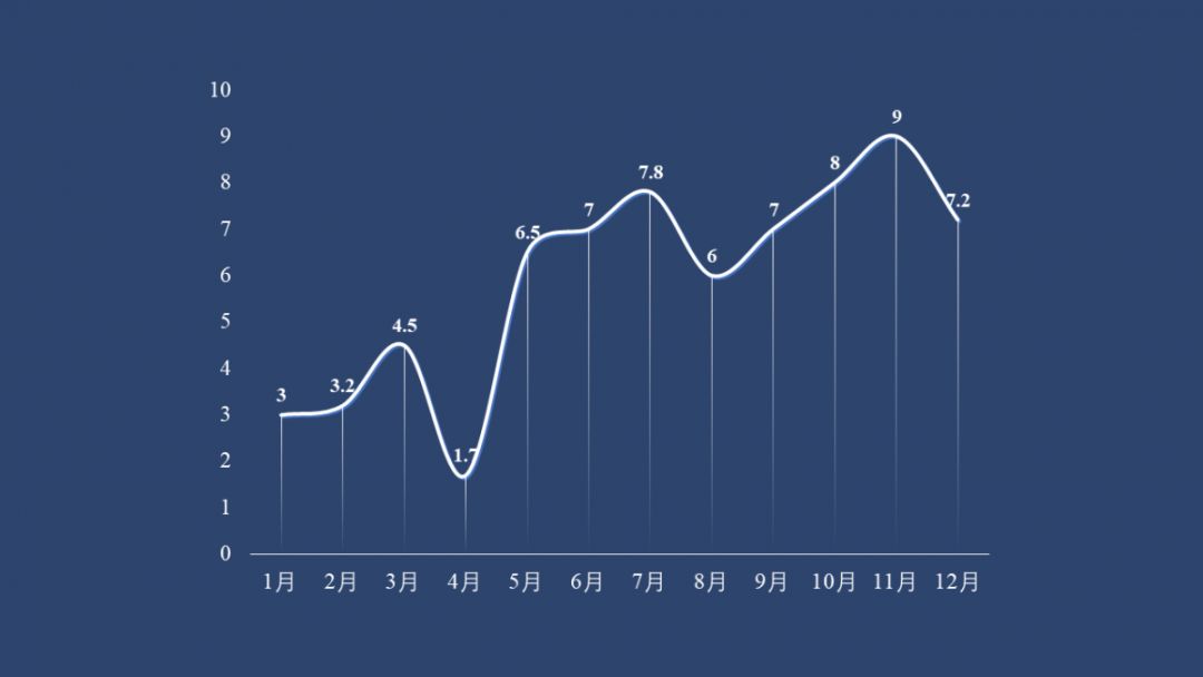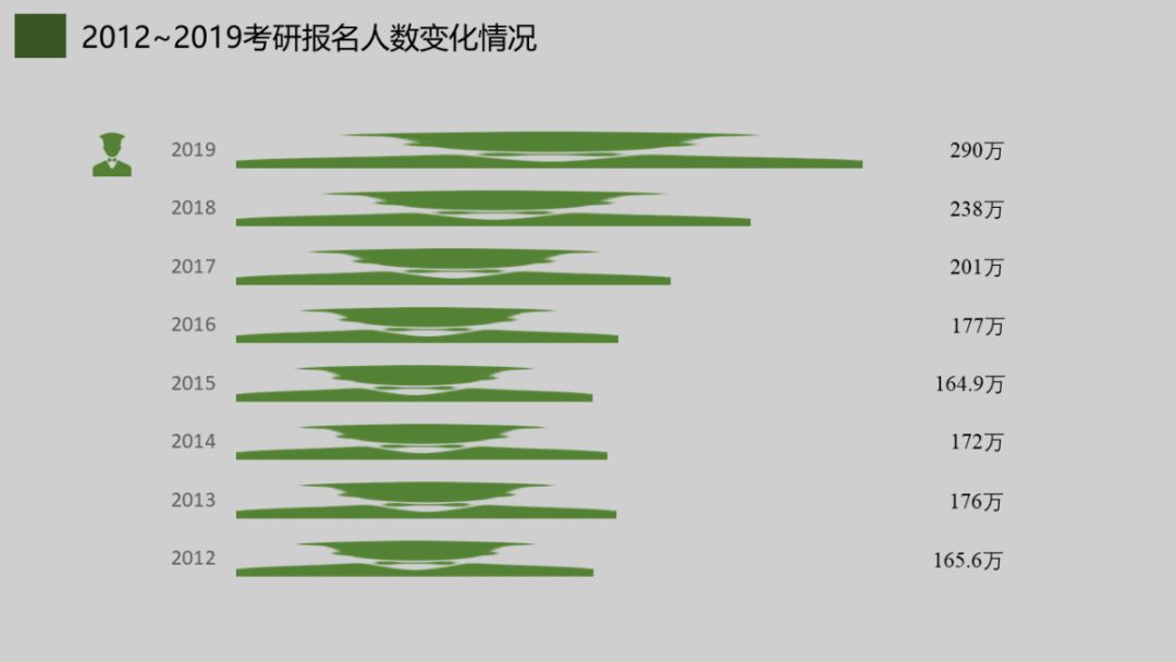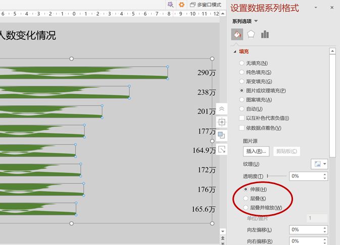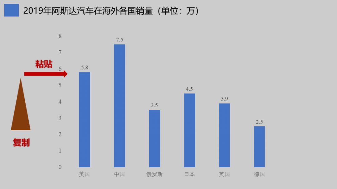 第25篇文章分享了选择图表类型的方法,但是,选对了图表只是第一步,常见的图表千篇一律,目标明确、兼具美感的图表才是万里挑一。 一款做工精致的图表能让你的汇报脱颖而出,能让领导和同事对你刮目相看...... 下面我们就来介绍4种常用图表(柱状图、条形图、饼图、折线图)的美容技巧,现学现用,推荐收藏~ 1 柱状图 柱状图的作用在于横向对比,侧重数量上的比较,以柱形填充色彩为载体。从这个特点出发,对柱状图有三种美化方法: ① 美化配色 从修改柱形图的颜色入手,例如下面这张图: 平平常常,但是看不清表达意图。 之前我们讲到用同类色对比的方法突出重点,这下正好派上用场,修改每一根柱子的填充色,使其色深渐变,效果如下: 既突出了最深色的中国(市场需求最大),又引人去留意最浅色的德国(需求最小)。 再来试一试无彩色与有彩色对比的方法,把中国改为红色,其余均为黑色,效果如下: ② 美化形状 当柱子变成三角形,会擦出怎样的火花? 在柱子附近插入一个三角形,然后将其复制-粘贴到任意一个柱子上,神奇的一幕出现了: 再调整一下,比如:去掉纵坐标轴,为三角形添加阴影,营造一种立体感,效果如下: ③ 丰富释义 如果我们想在横向对比各个国家的销量的同时,也想看到单个国家销量与总销量的对比,怎么办? 试试叠加柱形图! 步骤来啦: 第1步:右击图表,选择【编辑数据】-【在Excel中修改数据】 第2步:计算各国销量占比,然后添加一列全国销量,设为100%,如下图所示: 第3步:在PPT中选中新增的数据系列,【设置数据系列格式】-将系列绘制在【次坐标轴】; 第4步:调整主/次坐标轴的取值范围为0~1,即可形成两组柱形对齐叠放的状态,然后修改100%的那组数据柱形的透明度。 去掉网格线,修改配色,最终效果如下: 若在大型商务场合,可以将PPT背景调整为相关图片,会有商务范、国际范的效果,比如下面这张作品: 最后放个大招,打破柱形限制,将每根柱子移动到世界地图上 2 条形图 条形图可以理解为横过来的柱状图,因此美化技能可以沿用。 ① 美化配色 比如下面这张图,清一色的绿柱子看起来有些呆板 不妨试一试渐变色填充,从左至右颜色渐深: ② 简化要素、拟合趋势 点击图表元素,去掉网格和横坐标轴,添加数据标签,再添加【趋势线】-【更多选项】-【多项式趋势】 把背景改为图片呢? 再简化一步,把年份放在条形里,将数据标签居右侧对齐,又是一种新的体验: ③ 图案叠合 考研的是人,条形看起来不够生动不够人性,那好办,咱们之前分享过占比填充图的技能,好家伙,现在又派上用场了。先找到一个人形图标: 将其复制-粘贴到条形上,看起来有点凌乱: 关键一步来啦:选中图表右击,【设置数据系列格式】-【填充】-【将伸展改为层叠】 修改后效果如下: 3 饼图 饼图的主要目的是描述个体在总体中所占比例的情况,将圆形进行分割,主要载体是圆。这意味着我们只能在数据标签和圆形配色上下功夫。 ① 美化标签 比如,上面这张饼图的标签不太醒目,有没有什么办法把标签的表现方式优化一下呢?不妨插入一个圆形,圆形外框设置为白色,效果如下: 这样的“饼上有饼”是不是很有趣? ② 饼中有饼 另一个痛点:你是怎么处理“其他”占比部分的?尤其是当这些小类不得不被提及的时候? 有办法,输入详细数据之后,我们右击图表,选择【更改系列图表类型】,进入所有图表,选择饼图大类,选择【子母饼图】 得出的效果如下,这样就不用单独为“其他”再做一个饼图了 那么“其他”的分类是如何界定的呢? 右击图表,数据系列格式,看到下面的“系列分割依据”和“值小于”就明白了 ③ 环形设计 时下最流行的环形比例来啦,打破了饼的固执,将每个数据单独成为一个饼,中间为数据标签留出空白,既醒目又有逼格感。 绘制方法:依然是更改图表类型,在饼图大类中找到圆环图,但是在数据上要做一点调整哦~ 4 折线图 折线图以描述变化趋势为目的,以折线为载体,本身具备线条美,在美化折线图时,我们只需要做到“简而为之”,必要时“突出数据”。 ① 简化与深刻 下面是一张去掉了网格线、图例、标签的折线图 上面这张折线图不够柔美,主线不够深刻。 不如试试:右击图表,在数据系列格式找到【填充】-【线条】,最底部勾选【平滑线】,然后再将线条加粗一点,效果如下: 如果想突出数据怎么办? 删掉纵坐标轴,在折线上添加数据标签,然后,放大招了,将标记改为内置,圆形图案,填充颜色,如下图所示: 改造之后的效果: 往下拉个帘子呢? 看起来增添了些许科技感~ 这个“帘子”的做法也很简单:编辑图表的数据源,增加一组与源数据完全相同的数据,并添加到图表中,两条折线重叠在一起。选中新添加的数据系列,更改图表类型为【面积图】这样形成由两种图表类型组合而成的组合图表。其中面积图的边缘轮廓与折线图的线条轮廓一致。然后设置填充红色,如果大红色太刺眼了,可以降低透明度,然后去除面积图的边框。 ③ 套用设计 我们好像还忽略了一个法宝,那就是PPT顶部的【表格工具】-【设计】 里面有十余种可以套用的表格样式,比如说下面这个套用,有一种小提琴风格的美感: 今天的案例大家掌握了吗? 一定要动手试一试哦~