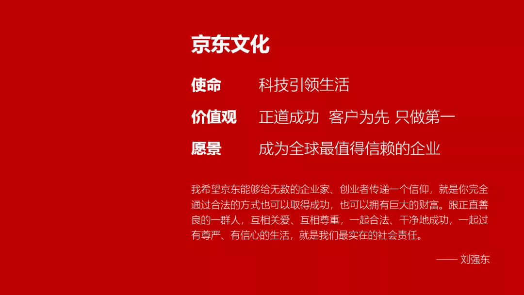 现在的页面是黑白色的,太单调了吧!所以我们要「Give PPT Color See See」。PPT 颜色搭配也是一个大学问,配不好容易辣眼睛~~这里告诉大家一个懒人配色法:向企业 LOGO 看齐。参考京东物流的企业 LOGO,很快就可以确定主色调是红色和白色。把配色迁移至 PPT,背景填充为红色,字体颜色调整成白色,轻松搞定!