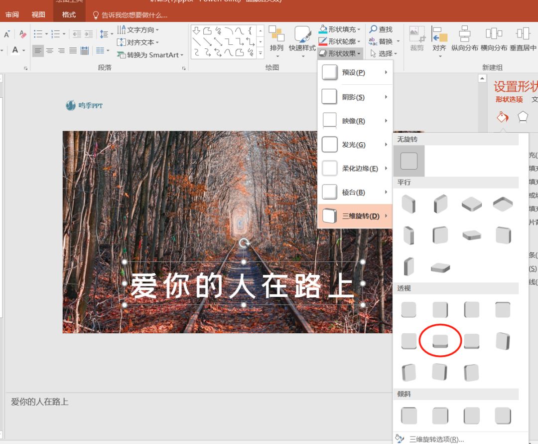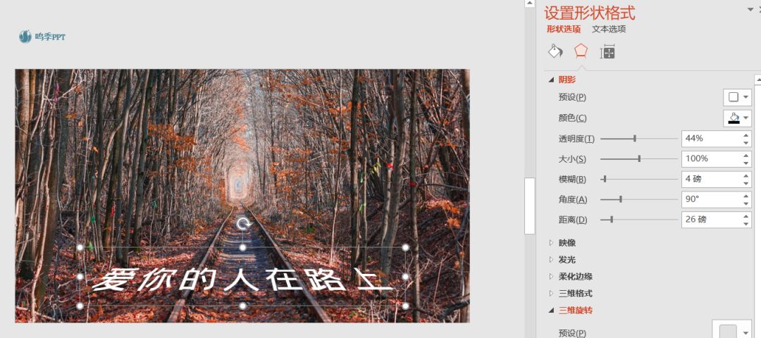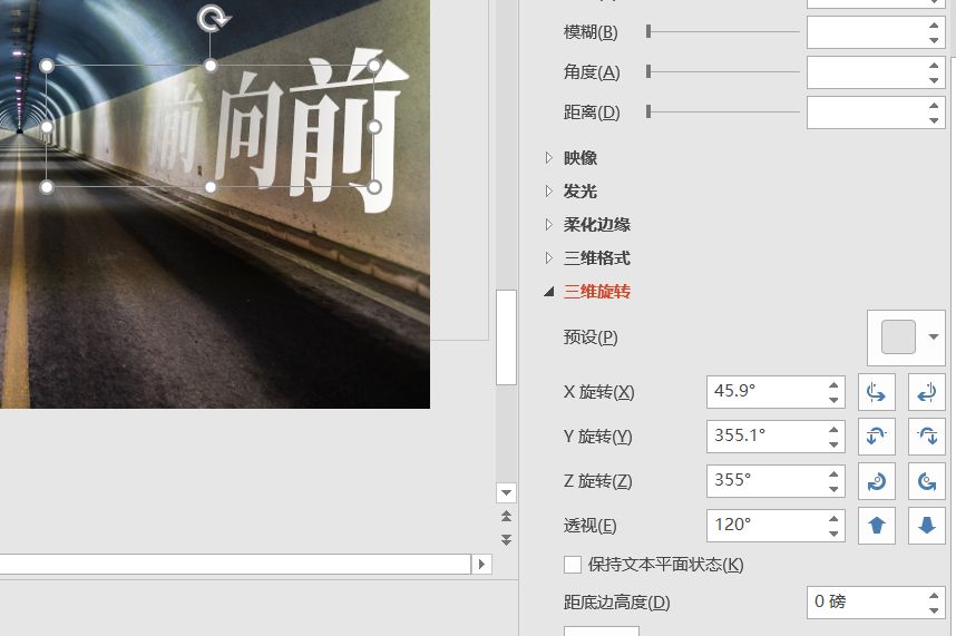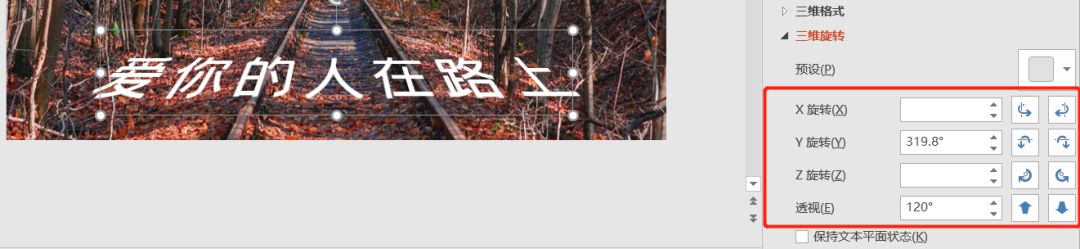 资深技巧课 PPT的文字与背景图融合技巧 图文融合技巧——文字融入空间 有些时候,我们PPT中会遇到类似这样,需要图文混排的页面。 如果只是单纯的将文字叠在图片上,效果过于生硬,不够吸引人。 我们观察到类似刚才那张图片,它实际是很有空间感的一张图,在处理这样的图片和文字组合的时候,我们其实可以进行一些更讨巧的设计——将文字融入背景图片的空间里。 在这里,我们需要用到三维旋转效果——这在我们之前的课程里有详细讲过。 《PPT图片效果之三维旋转》<<< 点击阅读 具体我们可以回顾一下上面这篇课文。 这里就不再深讲操作细节,直接讲一下处理的步骤。 我们先观察图片的空间感,我们发现它的空间感主要由铁道引导,向远处延伸,形成空间透视。 如果我们将文字顺着这种空间感摆放,那文字就能成功“进入”到图片里了。 我们将文字移动到大致的位置,然后设置它的三维旋转效果,在模板中,我们观察到这个模板最接近我们想要的效果。 可能第一次三维旋转后的效果并不理想,我们需要调整它,让它更与图片空间匹配。所以我们需要在设置形状格式窗格中,对三维旋转属性进行调整,这里我们只用调整【Y旋转】和【透视】两个属性。具体调整效果大家可以自己打开PPT软件对照尝试一下。 这里可以参考一下我调整的这个数值,文字和图片空间的匹配度已经很高了。 至此我们想要的效果已经基本完成了,我们还可以继续深入加工一些细节,比如这里我还给它增加了一些阴影,使它更具立体感。 我们看这个最终呈现的效果,是不是让画面更加生动有趣了。 利用这个思路,再配合更多的技巧,我们还能实现很多有趣的图文组合。 比如上面这张图。 具体步骤为: 先将文字进行半透明渐变的线性填充,然后进行三维旋转。 可以看到这张图为了契合空间,需要文字进行更多的旋转,所以三维旋转的四个属性值我都进行了详细设置。 具体还是需要同学们自己更改数值设置一下,也就都能清楚每个数值调整的效果了。 总结:巧妙运用三维旋转效果处理文字,可以使文字与背景图形成空间感融合。 搭配使用“将文字转换为形状”以及“半透明渐变填充”的技巧,会使得效果更加出彩。在修饰时可以尝试增加一点阴影、映像之类的效果,能让图文融合更加生动自然。 以上就是本课内容,介绍的两个案例属于抛砖引玉,大家按照这个思路多尝试做一做,可以做出更多更好看的PPT页面。