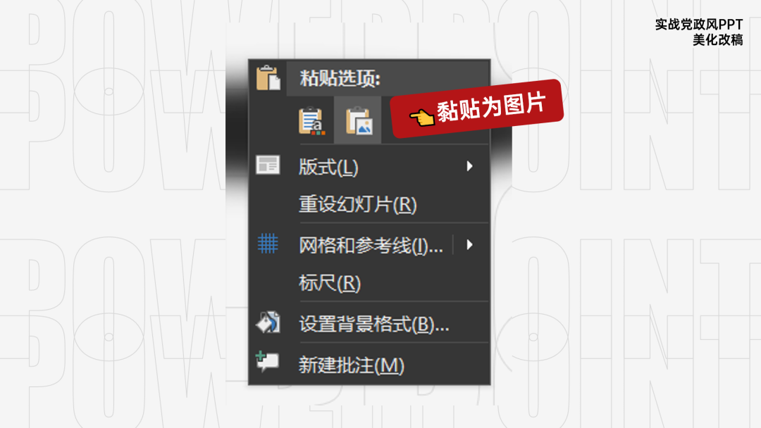 在前面几页美化好的PPT中,大多数都是红色背景,这时候我们可以来一些小改变,做背景反白处理: