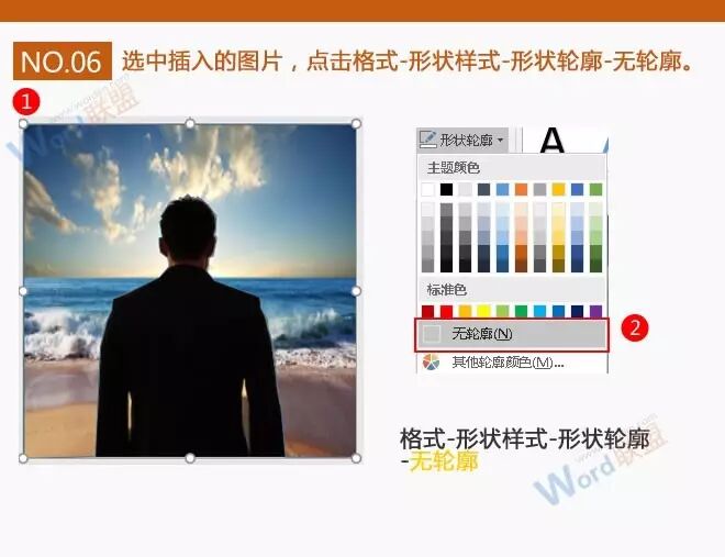 6、现在顿时感觉像换了个场景,衔接的十分完美。这时再选中插入的图片,点击格式-形状样式-形状轮廓-无轮廓。