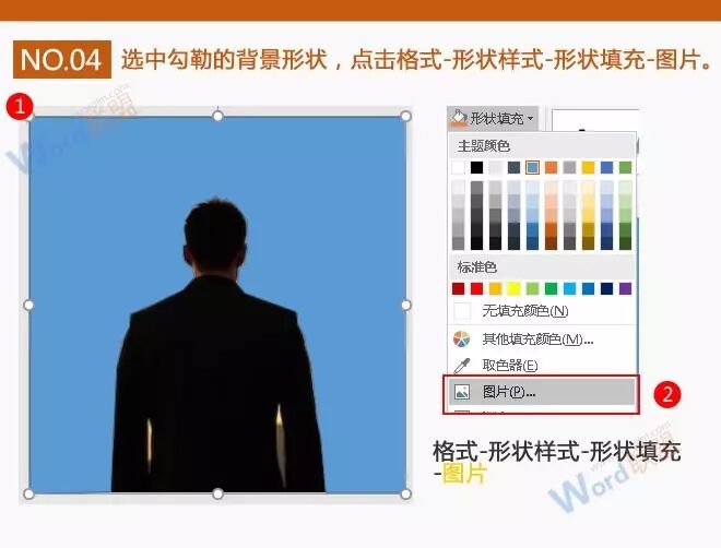 4、重要的一步来了,选中勾勒的背景形状,点击格式-形状样式-形状填充-图片。