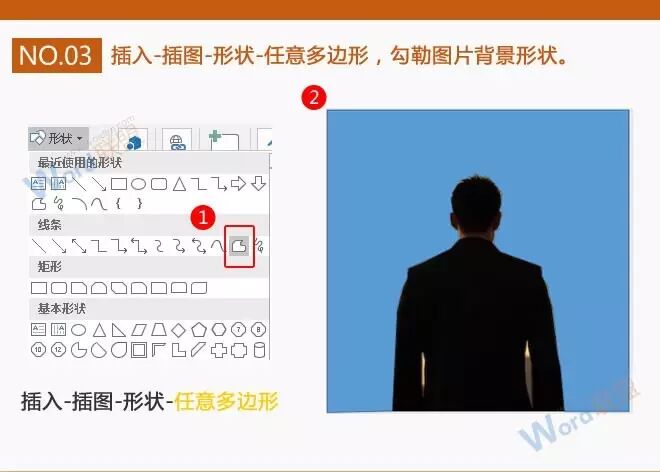 3、再次点击“插入”选项卡,在“插图”选项组的“形状”中选择“任意多边形”,勾勒处图片背景形状。