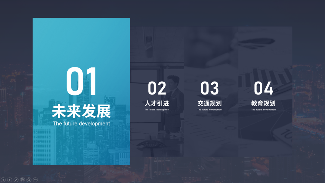 上面的过渡页都是只有一个信息的,我们也可以将目录和过渡页结合,只需要单独放大某个文案就行。