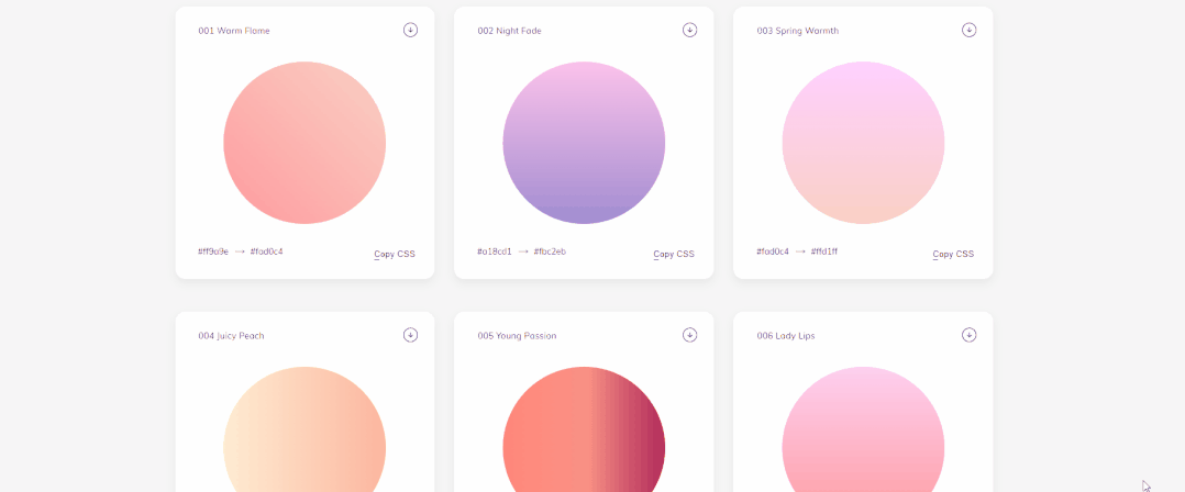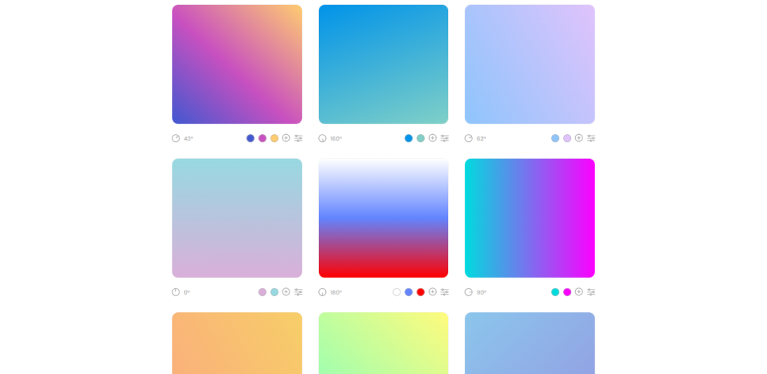 这个网站整理了 180 款线性渐变方案,同样在每个圆形卡片下方标注了色值。