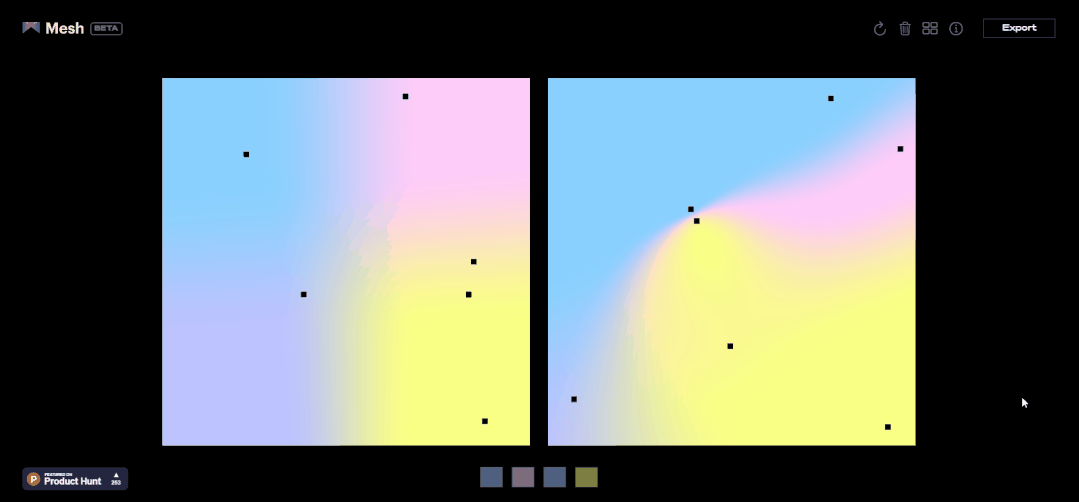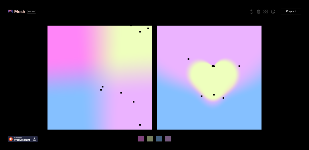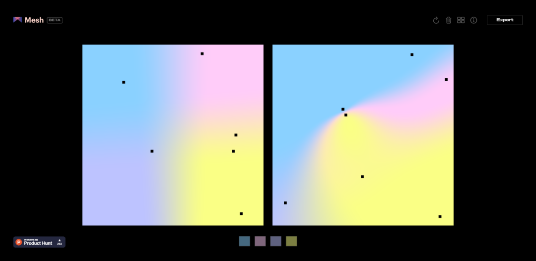而这个工具就有点意思了,它不仅可以改颜色,还可以自定义网格渐变的点位,从而生成创意渐变类型。