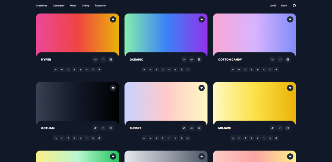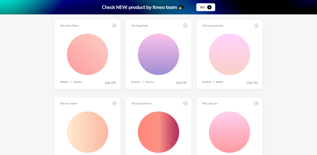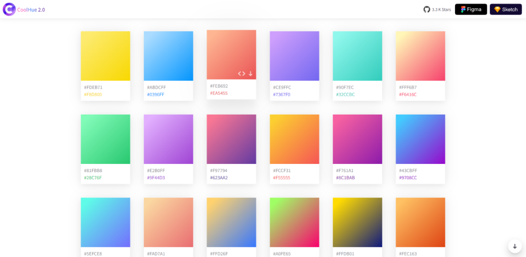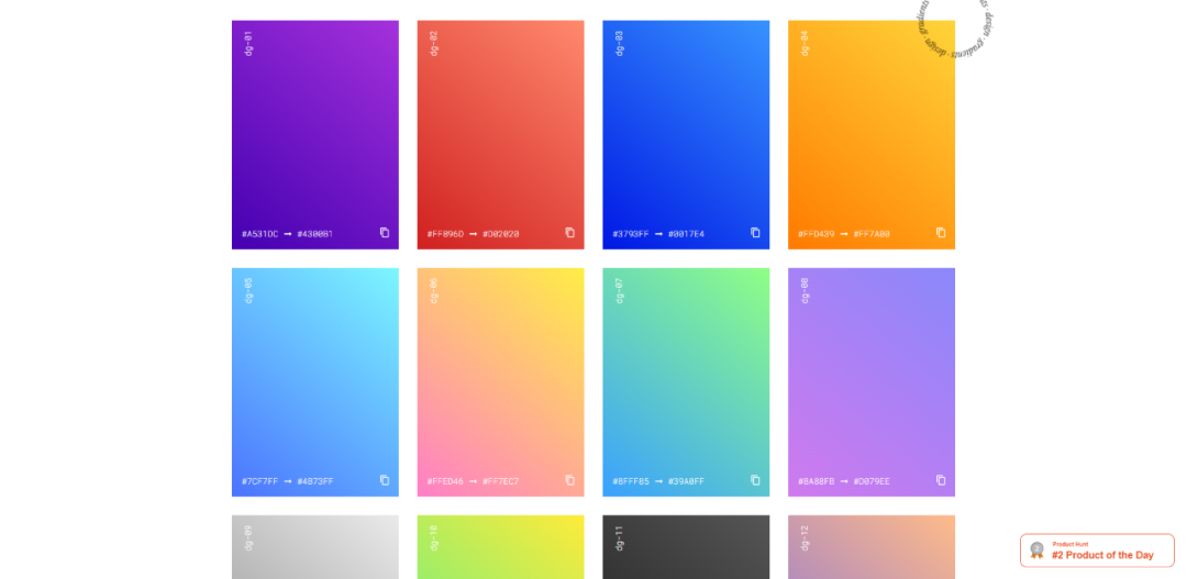 这个网站同样整合了 48 款精选的线性渐变方案,在每个卡片下方都有对应的色彩值。