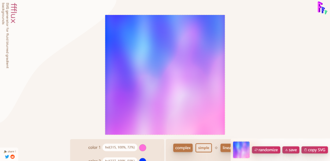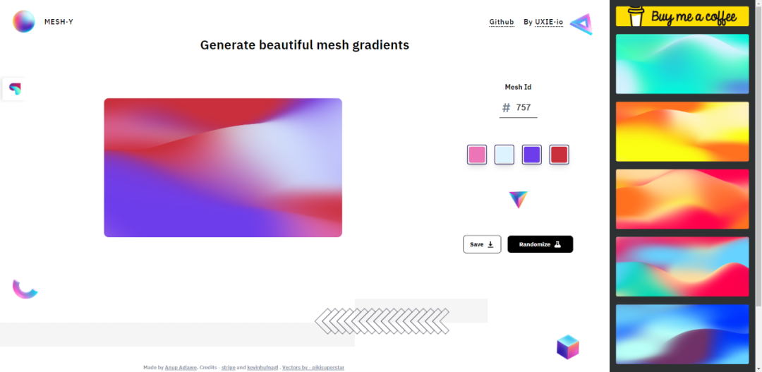 这个网站除了可以在右侧选择渐变类型,还可以自定义修改渐变的颜色,或者按 Randomize 随机生成。