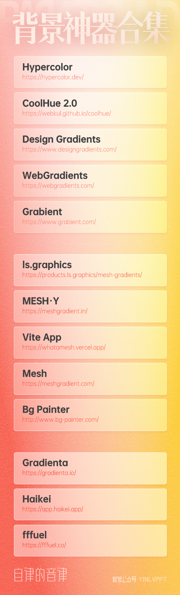 但接下来这 5 个在线工具生成的渐变背景,用 PPT 就很难实现了,或者说要花很多时间精力去做。