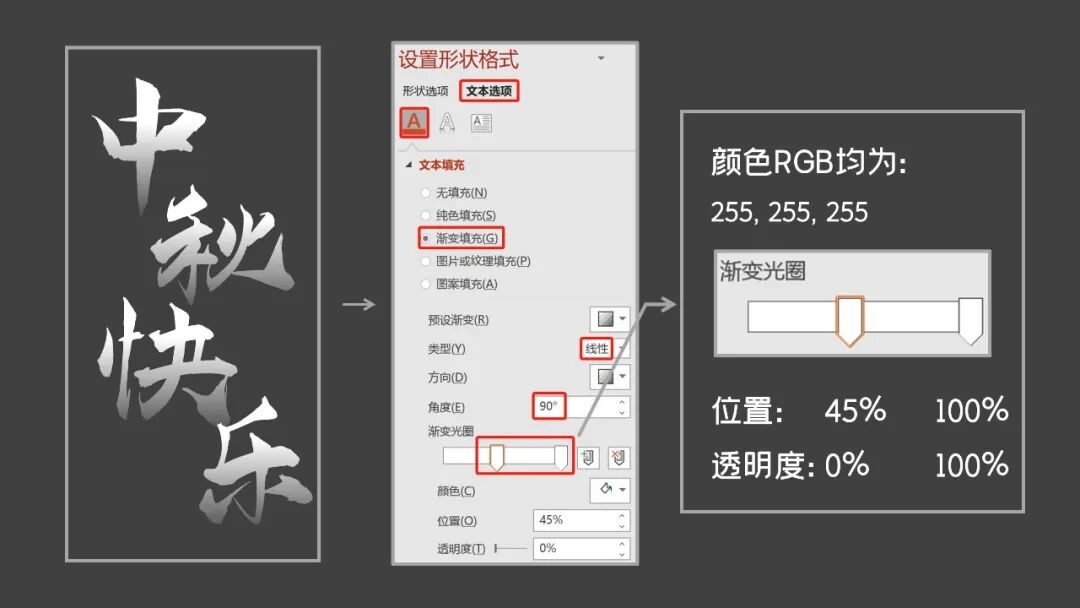 文字设置了白色的线性渐变,注意渐变滑块位置和透明度的调节哦!