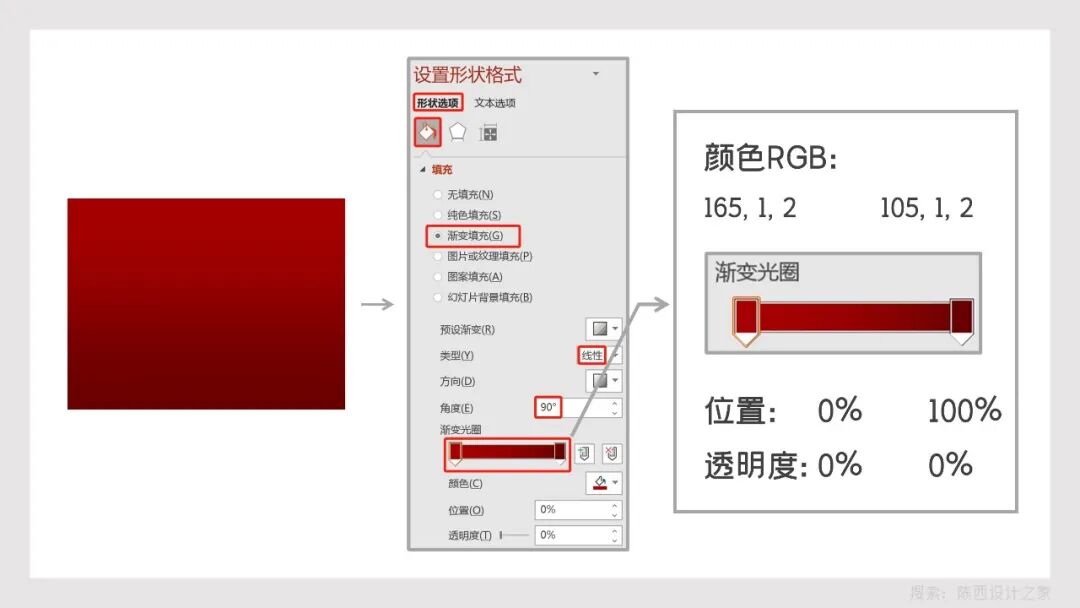 首先是关于红色渐变的设置。是一个90度的线性渐变,两个渐变滑块,重点在于这两个滑块颜色的选择。