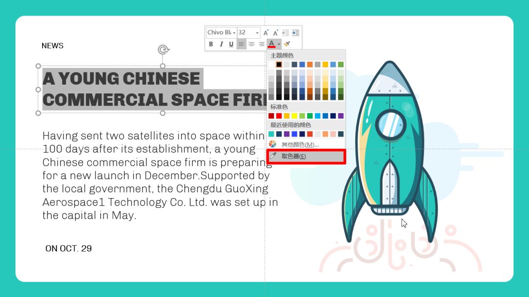 你还可以选中【文本框】——单击【右键】——选择【取色器】,吸取右侧图形里的深绿色,以替换文字的黑色,让整体更为协调: