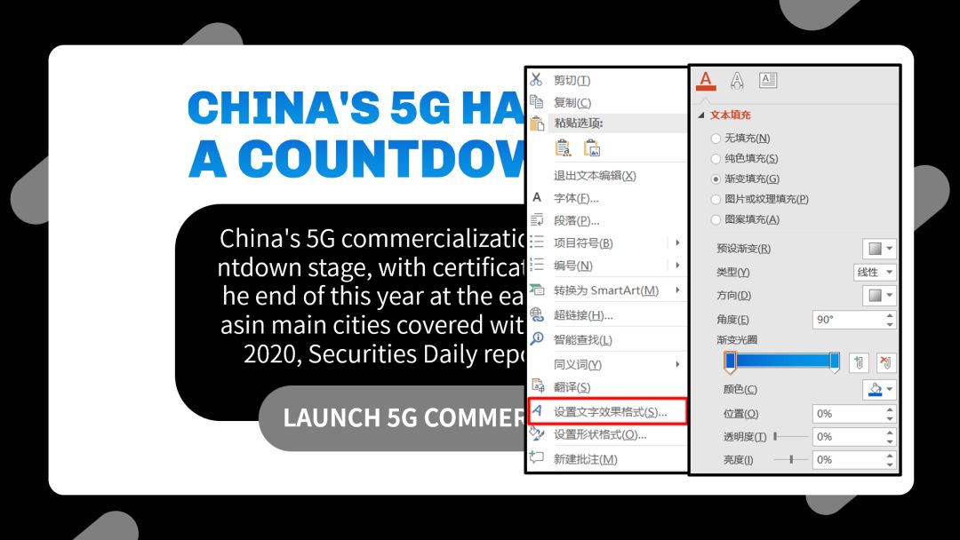 首先还是用光标选中文字——单击右键选择【设置文字效果格式】——再为文字设置【渐变填充】就搞定啦: