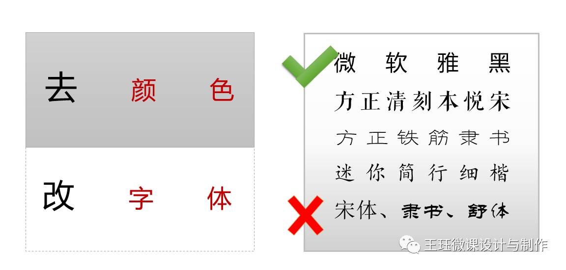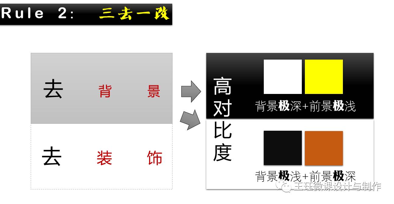 为了减少PPT的干扰,王珏老师提出PPT要做到“三去一改”,即:去背景、去装饰、去颜色、改字体。