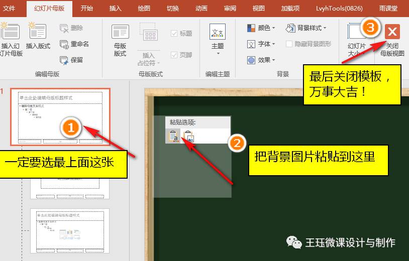 鼠标使劲向上拉,选中最上面第一张幻灯片,把您选中的背景图片粘贴到页面中,然后“关闭母版视图”,如下图: