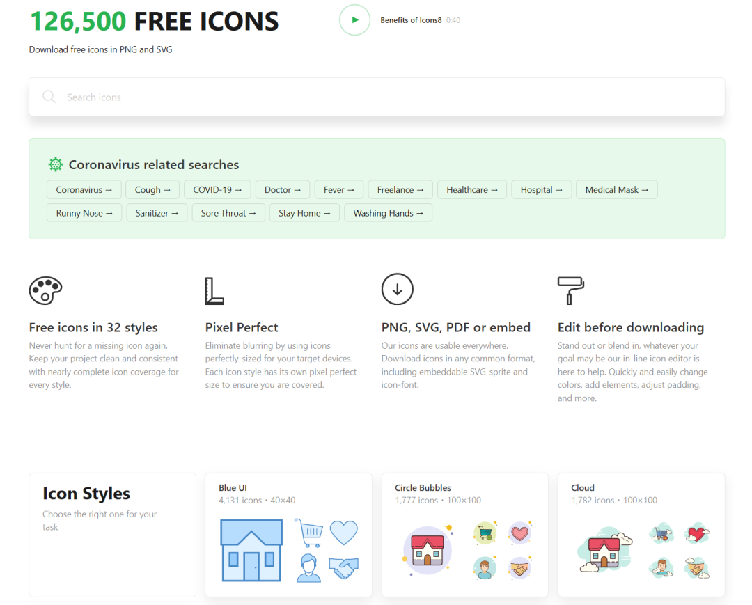 Icons8:一款使用方便且优雅的图标库,提供png免费下载,图标像素支持500px,且Icon8实现了80000+个图标的离线图标库,充分满足你的离线图标使用需求。