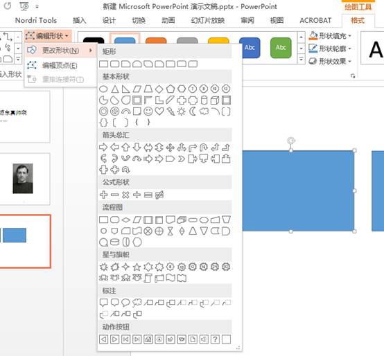 【更改形状】这个选项,应该大多数人都用过,它可以把已经画出来的形状更改为其他形状,比如把一个直角矩形更改成圆角矩形,或者改成椭圆。