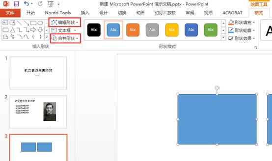 先随便插入个形状,然后选中这个形状,点击菜单栏里的【格式】,在下面工具栏的左侧会有【编辑形状】、【文本框】、【合并形状】三个工具按钮。