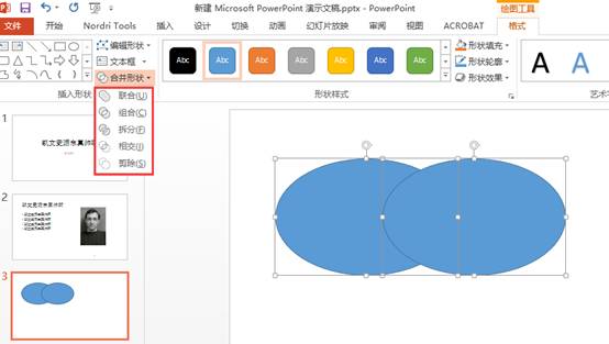 下面再看一下【合并形状】,顾名思义,这个工具是针对多个形状使用的。我们在幻灯片里先画两个形状出来,然后选中这两个形状,点击【格式】-【合并形状】,下面会弹出五个选项,分别是【联合】、【组合】、【拆分】、【相交】、【减除】。