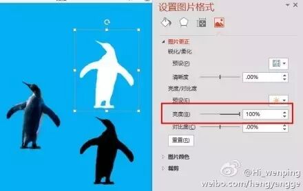 【PPT技巧22】【如何制作黑、白剪影效果】将图片亮度设为100%,为白色剪影;设为-100%,为黑色剪影。其实也可以用【曲线/任意多边形】简单勾勒出轮廓,然后填充颜色就可以了。