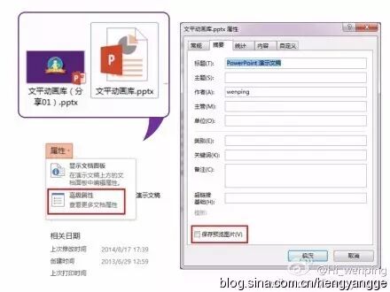 【PPT小技巧25】有木有发现有的PPT文件图标是文件第一页的预览图,而有的却是PPT图标。这是怎么回事呢?额,其实我只知道怎么改。打开文件,点击“文件-信息”,右侧,“属性-高级属性-摘要”,然后勾选最下方的“保存预览图片”。