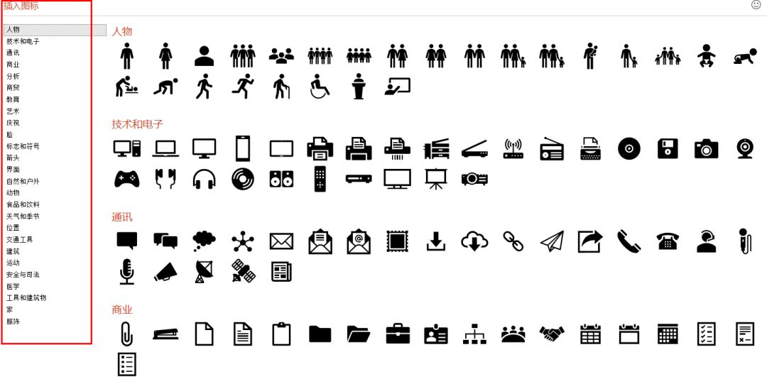 图标工具是PowerPoint 2016新增加的功能之一,在【插入】-【插图】组中点击【图标】按钮,即会弹出一个黑白的简洁图标库。